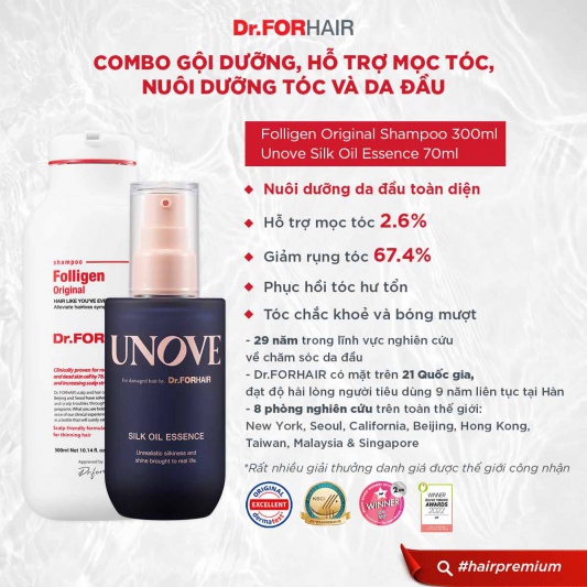 BỘ DẦU GỘI FOLLIGEN ORIGINAL VÀ TINH DẦU DƯỠNG TÓC UNOVE SILK OIL CỦA Dr.FORHAIR: