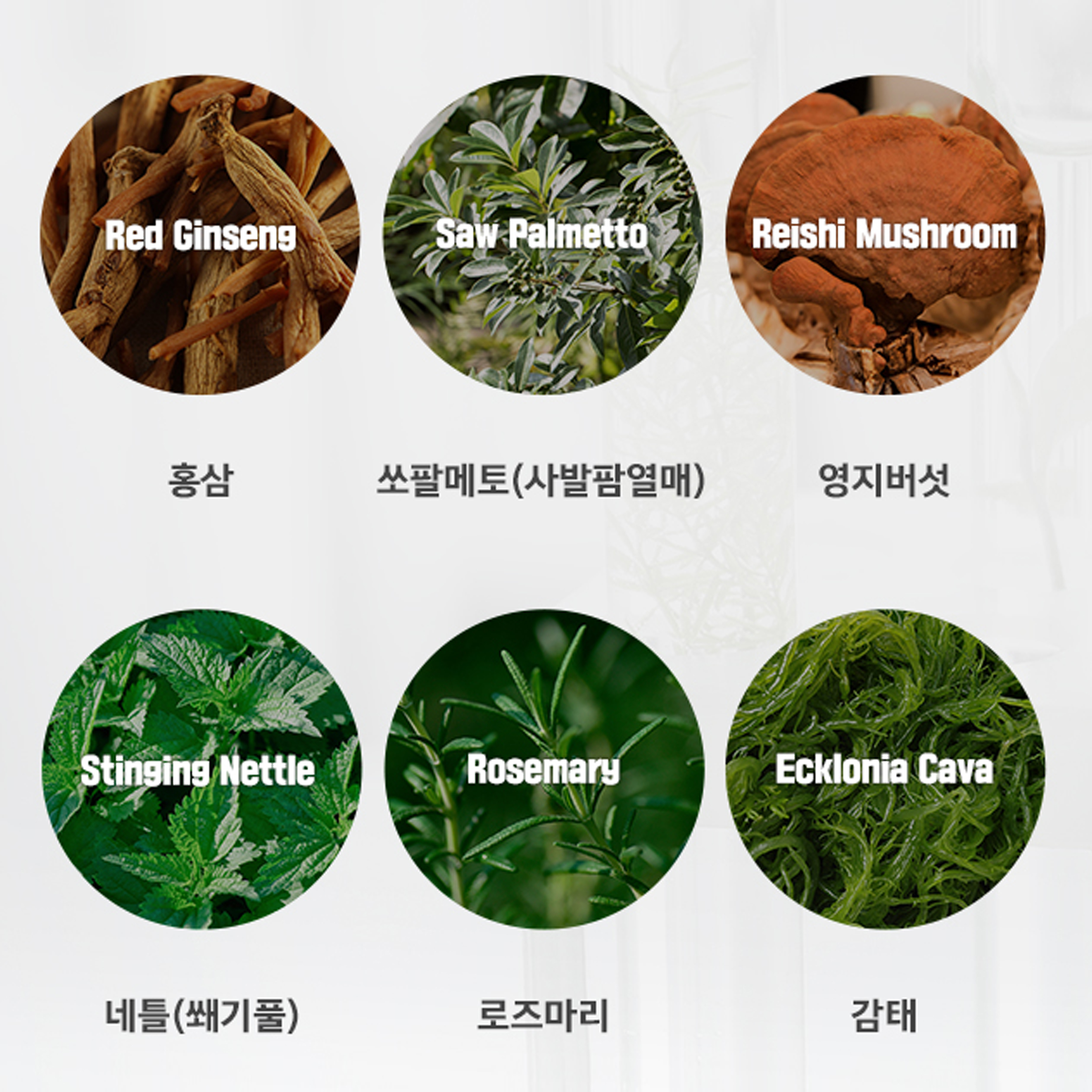 Thành phần tự nhiên như: dầu bạc hà, chiết xuất quả cọ, allantoin, chiết xuất nấm linh chi, chiết xuất hồng sâm, Chiết xuất lá hương thảo, chiết xuất Ecklonia cava, chiết xuất lá tầm ma, chiết xuất rễ hoa đá, chiết xuất rễ khoai mỡ, chiết xuất rễ hoa mẫu đơn, chiết xuất gừng, chiết xuất gosam...