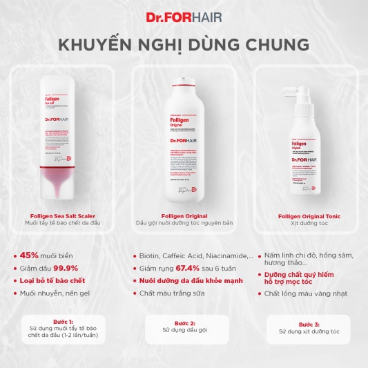Để tăng nhanh hiệu quả mọc tóc và chăm sóc da đầu chuyên sâu, có thể dùng kèm muối tẩy tế bào chết da đầu Folligen Sea Salt Scaler và dầu gội Folligen Original.